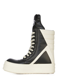 RICK OWENS FW25 CONCORDIANS RUNWAY MEGAGEOBASKETS IN BLACK/MILK/MILK FULL GRAIN CALF LEATHER THESE MEGAGEOBASKETS ARE MID-CALF HEIGHT. THEY TAKE OUR CLASSIC GEOBASKET AND BLOW IT UP TO A SOFT PADDED MEGA SIZE. THEY FEATURE AN EXTENDED TONGUE WITH WEBBING TAB, SIGNATURE GEOMETRIC PANELS AND A PADDED BACK COUNTER WITH LINES OF TOPSTITCHING. THEY HAVE NINE EYELETS, CONTRAST LACES, AND DOUBLE HEIGHT MEGA BUMPER SHARK-TOOTHED SOLES THIS MEDIUMWEIGHT FULL GRAIN CALF LEATHER HAS A FLAT AND MATTE SURFACE FINISH AND IS SPECIFICALLY TANNED FOR SHOES WITH AN ABRASION-RESISTANT FINISH THIS TANNERY IS LWG CERTIFIED WITH A BRONZE RATING COLOR: BLACK/MILK/MILK MATERIAL: UPPER 100% COW LEATHER LINING 100% CALF LEATHER INSOLE 100% CALF LEATHER SOLE HEIGHT 6.5CM