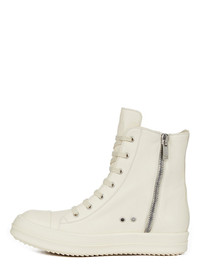 RICK OWENS FW23 LUXOR SNEAKERS IN MILK WHITE FULL GRAIN CALF LEATHER THESE SNEAKS ARE ABOVE-ANKLE HEIGHT AND FEATURE SEVEN EYELETS, LACES, A ZIPPER ON THE INSIDE ANKLE FOR EASY FASTENING, TOE CAPS AND SHARK-TOOTH SOLES THIS MEDIUMWEIGHT FULL GRAIN CALF LEATHER HAS A FLAT AND MATTE SURFACE FINISH AND IS SPECIFICALLY TANNED FOR SHOES WITH AN ABRASION-RESISTANT FINISH - COLOR: MILK WHITE - MATERIAL: UPPER 100% CALF LEATHER - TOE 100% CALF LEATHER - LINING 100% CALF LEATHER - INSOLE 100% CALF LEATHER - SOLE 100% THERMOPLASTIC RUBBER - MODEL IS WEARING SIZE 48 - MODEL IS 189 CM TALL