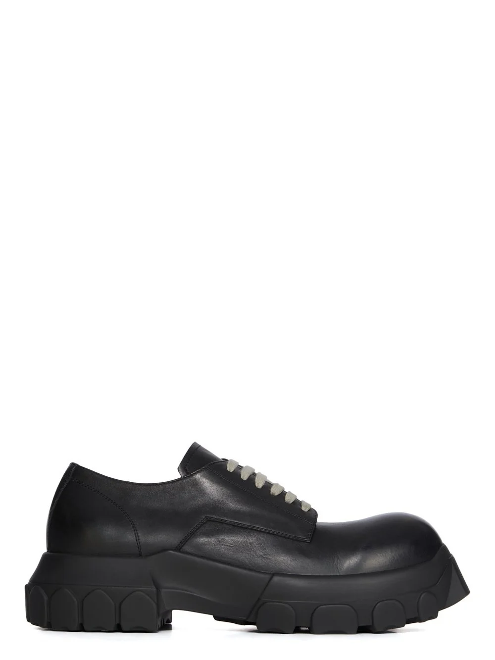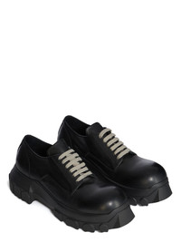 RICK OWENS FW25 CONCORDIANS LACEUP BOZO TRACTOR IN BLACK/BLACK WASHED CALF LEATHER THESE LACEUP BOZO TRACTORS ARE UNDER ANKLE HEIGHT. THEY HAVE A BOZO ROUNDED TOE, AN UPPER WITH ANGULAR PANELS WITH TOPSTITCHING AND PEARL LACES. THEY FEATURE A TRACTOR SOLE THIS MEDIUMWEIGHT COW LEATHER IS VEG TANNED AND FINISHED USING NATURAL WAXES. A FINAL WASH GIVES THIS LEATHER ITS SOFTNESS AND BRINGS OUT THE NATURAL GRAIN TEXTURE OF EACH SKIN. BECAUSE THIS SKIN IS NAKED, NOT FINISHED USING ANY PIGMENTS COVERING THE SKIN, NATURAL MARKINGS AND SHADINGS ARE VISIBLE WHICH MAKES EACH SKIN AND PRODUCT UNIQUE VEG TANNING MEANS ONLY VEGETAL AND NATURAL TANNINS WERE USED IN THE PROCESS OF TANNING AND PRESERVING THIS LEATHER THIS TANNERY IS LWG CERTIFIED WITH A SILVER RATING COLOR: BLACK/BLACK MATERIAL: UPPER 100% CALF LEATHER LINING 100% CALF LEATHER INSOLE 100% CALF LEATHER SOLE 100% THERMOPLASTIC POLYURETHANE SOLE AT TOE 3CM - AT HEEL 5CM