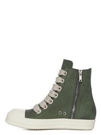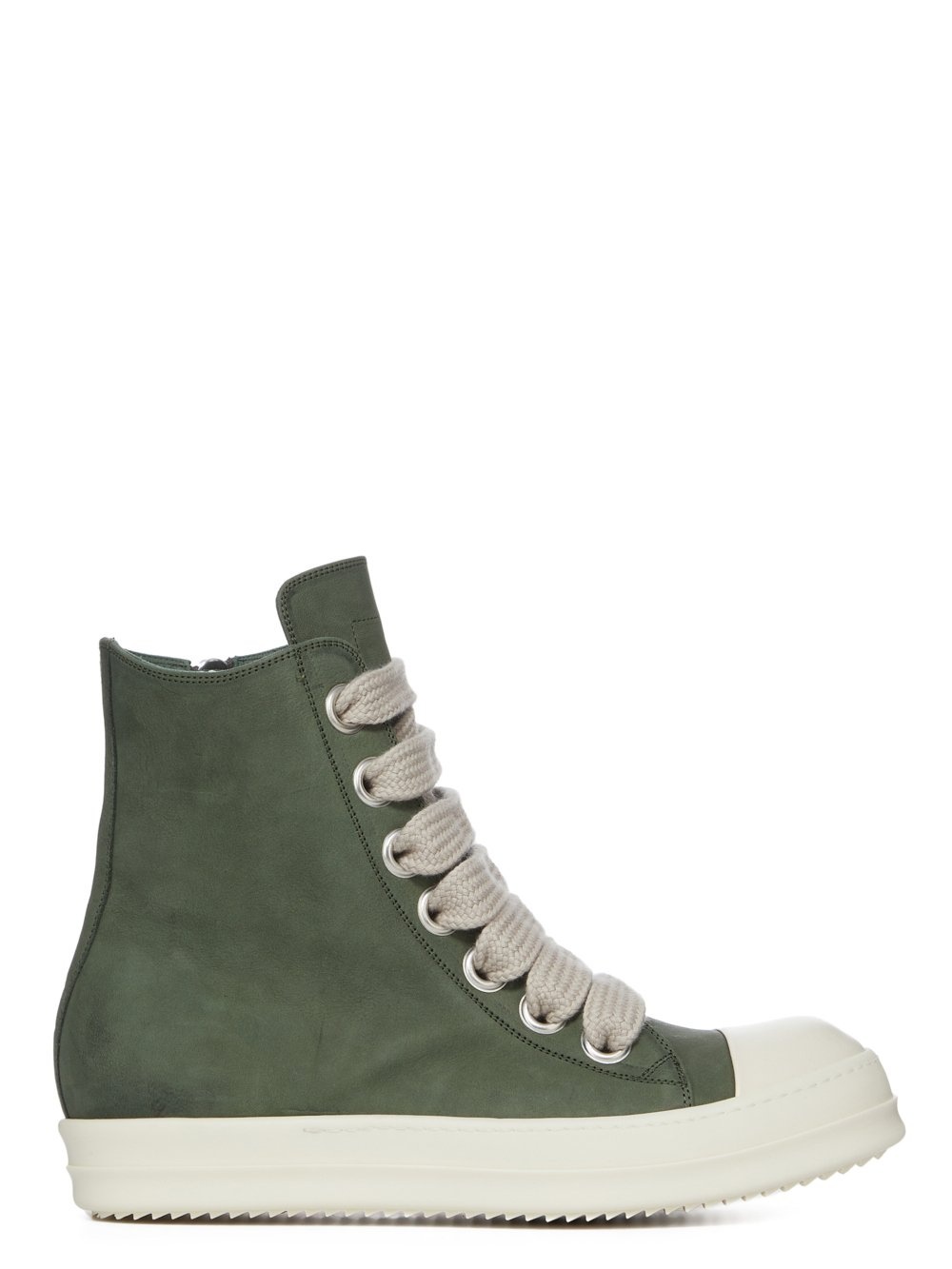 RICK OWENS SS23 EDFU RUNWAY SNEAKERS IN GREYWOLF NUBUCK THESE SNEAKERS ARE ABOVE ANKLE HEIGHT AND FEATURE SEVEN EYELETS, LACES, A ZIPPER ON THE INSIDE ANKLE FOR EASY FASTENING, TOE CAPS AND SHARK-TOOTH SOLESTHIS VERSION FEATURES JUMBO LACING THIS HEAVYWEIGHT SLIGHTLY RIGID NUBUCK BULLSKIN HAS A SOFT, BRUSHED FINISH. IT IS LEFT NAKED AND NOT COVERED WITH THE USUAL PIGMENTS AND FINISHINGS ; THEREFORE, THE UNIQUE NATURAL CHARACTERISTICS AND MARKINGS ARE VISIBLE IN EACH PRODUCT - COLOR: MOSS/MILK/MILK - MATERIAL: UPPER 100% BULL LEATHER - TOE 100% CALF LEATHER - LINING 100% CALF LEATHER - INSOLE 100% CALF LEATHER - SOLE 100% THERMOPLASTIC RUBBER
