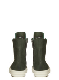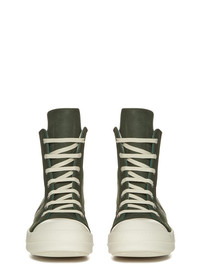 RICK OWENS SS23 EDFU SNEAKERS IN MOSS GREEN GREYWOLF NUBUCK THESE SNEAKERS ARE ABOVE-ANKLE HEIGHT AND FEATURE SEVEN EYELETS, LACES, A ZIPPER ON THE INSIDE ANKLE FOR EASY FASTENING, TOE CAPS AND SHARK-TOOTH SOLES THIS HEAVYWEIGHT SLIGHTLY RIGID NUBUCK BULLSKIN HAS A SOFT, BRUSHED FINISH. IT IS LEFT NAKED AND NOT COVERED WITH THE USUAL PIGMENTS AND FINISHINGS ; THEREFORE, THE UNIQUE NATURAL CHARACTERISTICS AND MARKINGS ARE VISIBLE IN EACH PRODUCT - COLOR: MOSS GREEN AND MILK WHITE - MATERIAL: UPPER 100% BULL LEATHER - TOE 100% CALF LEATHER - LINING 100% CALF LEATHER - INSOLE 100% CALF LEATHER - SOLE 100% THERMOPLASTIC RUBBER