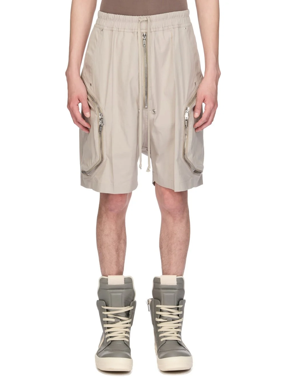 RICK OWENS SS26 TEMPLE HEIZER BELA IN PEARL HEAVY POPLIN THESE BLIXA BELA ARE BELOW-KNEE LENGTH SHORTS WITH A LOW, DROPPED CROTCH. THEY HAVE AN ELASTICIZED WAISTBAND WITH DRAWSTRING, A BELA EXPOSED CENTER ZIPPER WITH TWO SNAP DETAIL, AT BOTTOM. THEY FEATURE BLIXA, TWO-WAY ZIPPERED POCKETS ON EACH THIGH, AND HAVE SIDE WELT POCKETS WITH EYELET AND RIVET DETAIL AND BACK POCKETS WITH CONCEALED SNAPS THIS MEDIUMWEIGHT COTTON POPLIN HAS A CRISP HANDFEEL AND WASHED FINISH THIS FABRIC IS MADE USING GOTS CERTIFIED ORGANIC COTTON WHICH MEANS THE NATURAL FIBRE IS GROWN WITHOUT HARMFUL CHEMICALS, LEAVING OUR SOIL, AIR AND WATER CLEANER FROM CONTAMINATES COLOR: PEARL MATERIAL:97% COTTON + 3% ELASTANE MODEL IS 189CM TALL MODEL WEARS SIZE 48