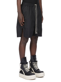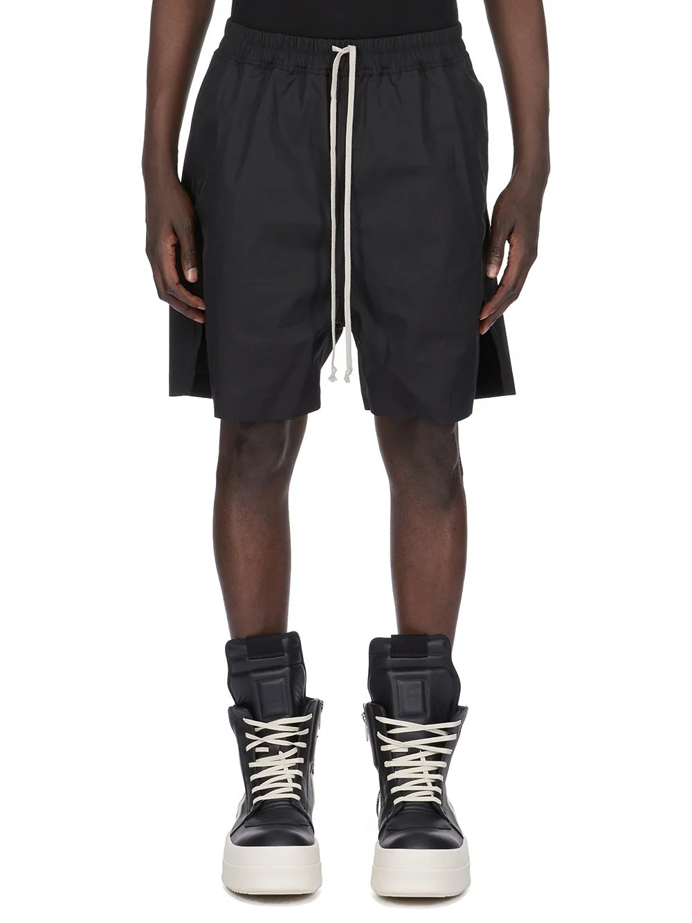 RICK OWENS SS25 HOLLYWOOD BOXERS IN BLACK HEAVY COTTON POPLIN THESE BOXERS ARE KNEE-LENGTH. THEY HAVE AN ELASTICIZED WAISTBAND WITH DRAWSTRING, A SLIGHTLY DROPPED CROTCH, SIDE WELT POCKETS AND BEVELED SIDE SPLITS THIS MEDIUMWEIGHT COTTON POPLIN HAS A CRISP HANDFEEL AND WASHED FINISH THIS FABRIC IS MADE USING GOTS CERTIFIED ORGANIC COTTON WHICH MEANS THE NATURAL FIBER IS GROWN WITHOUT HARMFUL CHEMICALS, LEAVING OUR SOIL, AIR AND WATER CLEANER FROM CONTAMINATES COLOR: BLACK MATERIAL: 97% COTTON + 3% ELASTANE MODEL IS 189CM TALL MODEL WEARS SIZE 48