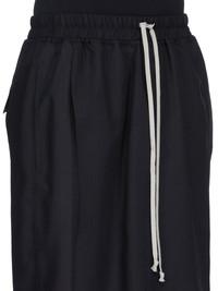 RICK OWENS SS26 TEMPLE KILTSHORTS IN BLACK WOOL GAUZE THESE KILTSHORTS ARE KNEE LENGTH WITH AN AMPLE FIT. THEY FEATURE AN ELASTICIZED WAISTBAND WITH DRAWSTRING AND A FRONT KILT FLAP. THEY FEATURE SIDE SEAM POCKETS AND REAR POCKETS WITH FLAPS, ALL WITH CONCEALED SNAPS AND TOPSTITCHING THIS LIGHTWEIGHT AND SEMI TRANSPARENT WOOL GAUZE HAS A SOFT HANDFEEL. IT IS WOVEN IN THE BIELLA REGION OF ITALY RENOWNED FOR ITS LONG TRADITION OF TAILORED WOOL THIS FABRIC IS MADE FROM ZQ CERTIFIED VIRGIN WOOL WHICH ENSURES A HIGH STANDARD IN ANUMAL WELFARE, ENVIRONMENTAL SUSTAINIBILITY AND SOCIAL RESPONSIBILITY. EACH BALE OF WOOL IS TRACEABLE BACK TO ITS SOURCE COLOR: BLACK MATERIAL:100% NEW WOOL BUTTONS 100% BUFFALO HORN MODEL IS 189CM TALL MODEL WEARS SIZE 48