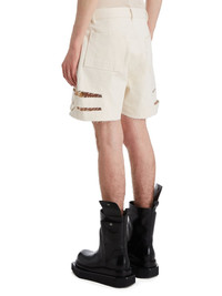 RICK OWENS SS22 FOGACHINE RUNWAY RAW SPARTAN CUTOFFS IN 16OZ NATURAL SELVEDGE DENIM THESE RAW SPARTAN CUTOFFS ARE A MID-THIGH LENGTH 5 POCKET CUTOFFS WITH A LOW-RISE. THEY HAVE A BUTTON FLY, ANGULAR FRONT POCKETS AND TWO SQUARE BACK POCKETS WITH TOPSTITCHING. THEY FEATURE HORIZONTAL SPARTAN STRAPS INTERLOCKING WITH VERTICAL TABS ON THE OUTSIDE LEG THIS HEAVYWEIGHT DENIM IS WOVEN IN IBARA CITY, OKAYAMA PREFECTURE, BY YAMAASHI ORIMONO (EST. 1945) ON VINTAGE SAKAMOTO SHUTTLE LOOMS. THIS TECHNIQUE USES A NATURAL WARP AND NATURAL WEFT THREADS AND HAS A TRADITIONAL RED SELVEDGE - COLOR:NATURAL - MATERIAL: - MODEL IS WEARING SIZE 48 - MODEL IS 189 CM TALL
