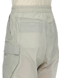 RICK OWENS SS23 EDFU CARGOBELA SHORTS IN GRAPHENE RIP STOP THESE CARGOBELA SHORTS ARE KNEE-LENGTH WITH A LOW CROTCH AND WIDE LEG. THEY FEATURE AN ELASTICIZED WAISTBAND WITH DRAWSTRING AND A BELA EXPOSED CENTER ZIPPER WITH SNAP DETAIL. THEY FEATURE TWO BEVELED FLAP CARGO POCKETS ON THE SIDE LEG WITH TWO REAR WELT POCKETS, ALL WITH CONCEALED SNAPS AND TOPSTITCHING, AND TWO SIDE WELT POCKETS WITH RIVET AND EYELET DETAIL THIS LIGHTWEIGHT AND SEMI-TRANSPARENT TECHNICAL MATERIAL IS MADE USING GRAPHENE, A CARBON FIBER THAT ADDS EXTRA TEAR STRENGTH. - COLOR: PEARL - MATERIAL: 100% NYLON - MODEL IS WEARING SIZE 48 - MODEL IS 189 CM TALL
