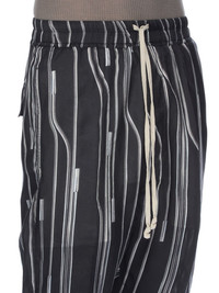 RICK OWENS FW25 CONCORDIANS RICK S PODS IN BLACK/PEARL PRINTED CUPRO JAPONETTE THESE RICK'S PODS ARE BELOW KNEE LENGTH SHORTS WITH A LOW DROPPED CROTCH. THEY HAVE AN ELASTICIZED WAISTBAND WITH DRAWSTRING, CONCEALED FLY, TWO SIDE POCKETS AND TWO SQUARE BACK POCKETS WITH FLAPS. THEY HAVE A ROUNDED PANEL BETWEEN THE LEGS AND DOUBLE TOPSTITCHING THIS LIGHTWEIGHT AND FLUID JAPONETTE HAS A COOL HANDFEEL AND IS DIGITALLY PRINTED WITH OUR SEASONAL SNAKE CHAIN MOTIF THIS FABRIC IS MADE USING CUPRO WHICH IS BIODEGRADABLE AND 100% PLANT BASED. AS IT’S MADE FROM COTTON WASTE, CUPRO HELPS FIND A PURPOSE TO FIBERS THAT WOULD OTHERWISE BE DISCARDED COLOR: BLACK/PEARL MATERIAL: 100% CUPRO BUTTONS 100% BUFFALO HORN MODEL IS 189CM TALL MODEL WEARS SIZE 48