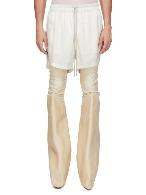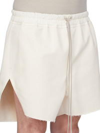 RICK OWENS SS25 HOLLYWOOD RUNWAY BOXERS IN NATURAL COTTON CANVAS THESE BOXERS ARE ABOVE KNEE LENGTH WITH A LOOSE FIT. THEY HAVE AN ELASTICIZED WAISTBAND WITH DRAWSTRING, SIDE POCKETS AND BEVELED SPLITS IN THE HEM AT THE SIDE SEAMS THIS MEDIUMWEIGHT COTTON CANVAS IS COMPACT WITH A SOFT HANDFEEL. THIS FABRIC IS MADE USING GOTS CERTIFIED ORGANIC COTTON WHICH MEANS THE NATURAL FIBER IS GROWN WITHOUT HARMFUL CHEMICALS, LEAVING OUR SOIL, AIR AND WATER CLEANER FROM CONTAMINATES COLOR: NATURAL MATERIAL: 100% COTTON BAND 97% COTTON + 3% ELASTANE MODEL IS 189CM TALL MODEL WEARS SIZE 48