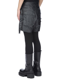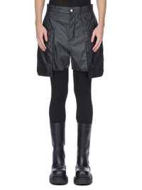 RICK OWENS FW25 CONCORDIANS STEFAN CARGO SHORTS IN BLACK COATED POPLIN THESE STEFAN CARGO SHORTS ARE A KNEE LENGTH 5 POCKET JEAN WITH A LOW-RISE AND A LOOSE FIT. THEY HAVE A SILVER BUTTON FLY, BELT LOOPS AND POCKET RIVETS. THEY FEATURE SIDE WELT POCKETS WITH RIVETS, OVERLAYED WITH LARGE POCKETS WITH SQUARE CORNERS AND A BEVELED BOTTOM WHICH EXTEND BELOW THE HEM ON THE FRONT THIGHS WITH LOOPS, AND REAR POCKETS WITH FLAPS AND SCRATCH CLOSURES. THIS LIGHTWEIGHT COTTON POPLIN HAS A SEMI SHINY WATER REPELLENT WAX COATING AND A CRISPY HAND FEEL. THIS FABRIC IS MADE USING GOTS CERTIFIED ORGANIC COTTON WHICH MEANS THE NATURAL FIBER IS GROWN WITHOUT HARMFUL CHEMICALS, LEAVING OUR SOIL, AIR AND WATER CLEANER FROM CONTAMINATES. COLOR: BLACK MATERIAL: 93% COTTON + 7% POLYURETHANE MODEL IS 189CM TALL MODEL WEARS SIZE 31