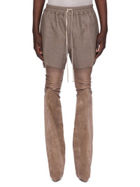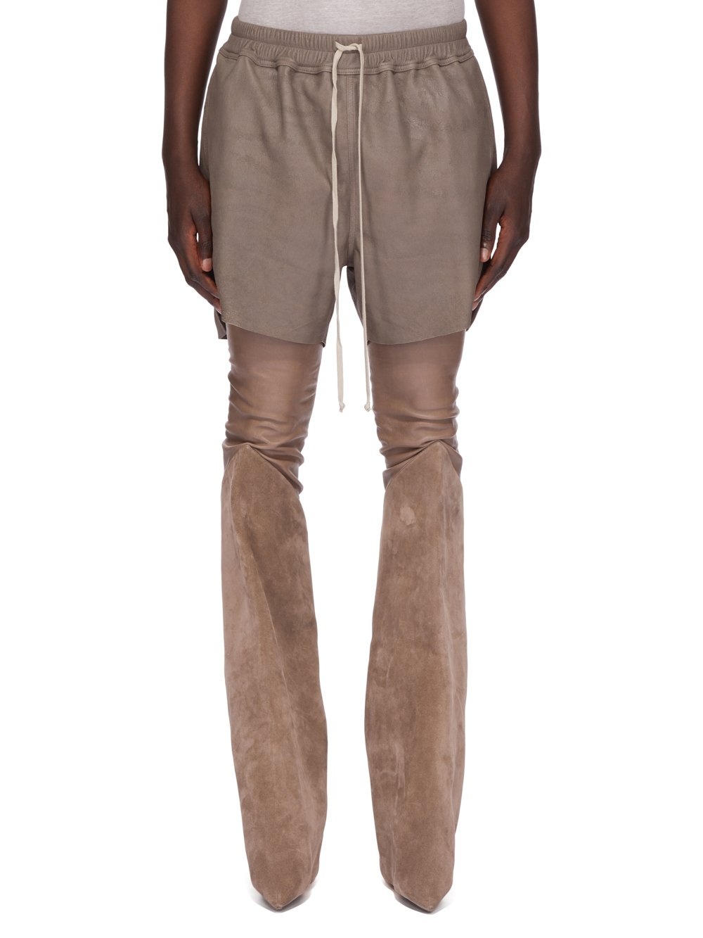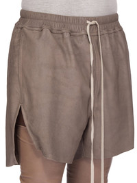 RICK OWENS SS25 HOLLYWOOD RUNWAY BOXERS IN DUST BLISTER LAMB LEATHER THESE BOXERS ARE ABOVE KNEE LENGTH WITH A LOOSE FIT. THEY HAVE AN ELASTICIZED WAISTBAND WITH DRAWSTRING, SIDE POCKETS AND BEVELED SPLITS IN THE HEM AT THE SIDE SEAMS THIS LIGHTWEIGHT LAMB LEATHER HAS AN EXAGGERATED UNEVEN BLISTERED TEXTURE AND A SOFT, FLUID HANDFEEL. THE BLISTERED TEXTURE IS ACHIEVED BY EXAGGERATING THE NATURAL GRAIN TEXTURE OF EACH SKIN, THEREFORE THE LOOK OF EACH SKIN IS UNIQUE THIS LEATHER IS MADE BY A THIRD GENERATION FAMILY OWNED TANNERY IN THE SOUTH OF ITALY. COLOR: DUST MATERIAL: 100% LAMB LEATHER LINING 100% COTTON MODEL IS 189CM TALL MODEL WEARS SIZE 48