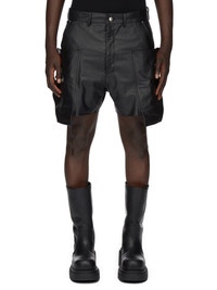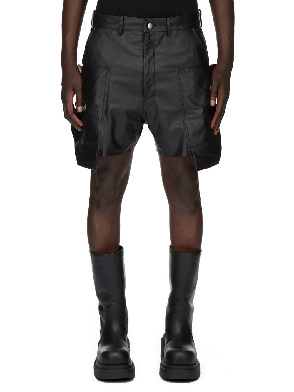 RICK OWENS SS24 LIDO RUNWAY STEFAN CARGO SHORTS IN BLACK OILY CALF THESE STEFAN CARGO SHORTS ARE KNEE LENGTH, 5 POCKET SHORT, WITH A LOW-RISE AND A LOOSE FIT. THEY HAVE A SILVER BUTTON FLY, BELT LOOPS AND POCKET RIVETS. THEY FEATURE SIDE WELT POCKETS WITH RIVETS, OVERLAYED WITH LARGE POCKETS WITH SQUARE CORNERS AND A BEVELLED BOTTOM THAT EXTEND BELOW THE HEM ON THE FRONT THIGHS. THEY HAVE LOOPS, AND REAR POCKETS WITH FLAPS AND SCRATCH CLOSURESTHIS HEAVYWEIGHT AND OILY CALF LEATHER IS VEG TANNED AND FINISHED USING NATURAL WAXES WHICH MAKES A SUPPLE AND OILY HANDFEEL. BECAUSE THIS SKIN IS NAKED, NOT FINISHED USING ANY PIGMENTS COVERING THE SKIN, NATURAL MARKINGS AND SHADINGS ARE VISIBLE WHICH MAKES EACH SKIN AND PRODUCT UNIQUE. VEG TANNING MEANS ONLY VEGETAL AND NATURAL TANNINS WERE USED IN THE PROCESS OF TANNING AND PRESERVING THIS LEATHER.THIS TANNERY IS LWG CERTIFIED WITH A GOLD RATING. - COLOR: BLACK - MATERIAL: 100% CALF LEATHER - LINING 100% CUPRO - MODEL IS 189CM TALL - MODEL WEARS SIZE 31