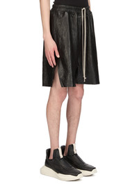 RICK OWENS SS26 TEMPLE BOXERS IN BLACK TUMBLED LAMB THESE BOXERS ARE KNEE-LENGTH. THEY HAVE AN ELASTICIZED WAISTBAND WITH DRAWSTRING, A SLIGHTLY DROPPED CROTCH, SIDE WELT POCKETS AND BEVELED SIDE SPLITS THIS MEDIUMWEIGHT LAMB LEATHER IS VEG TANNED AND FINISHED WITH ANILINE. THE SURFACE TEXTURE, WHICH IS THE NATURAL GRAIN OF THE SKIN, IS ACHIEVED BY TUMBLING THE SKINS FOR 15 HOURS IN A WOODEN DRUM VEG TANNING MEANS ONLY VEGETAL AND NATURAL TANNINS WERE USED IN THE PROCESS OF TANNING AND PRESERVING THIS LEATHER THIS TANNERY IS LWG AUDITED COLOR: BLACK MATERIAL:100% LAMB LEATHER LINING 100% CUPRO MODEL IS 189CM TALL MODEL WEARS SIZE 48