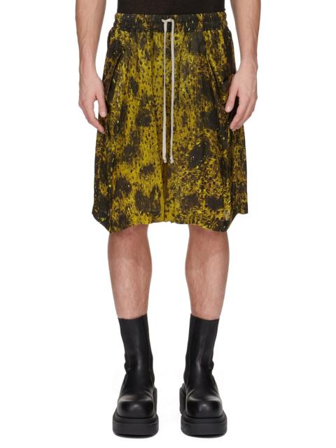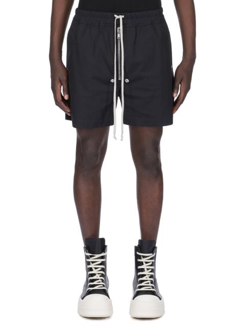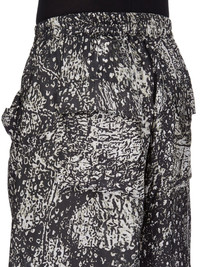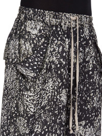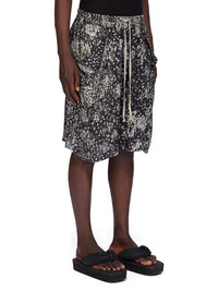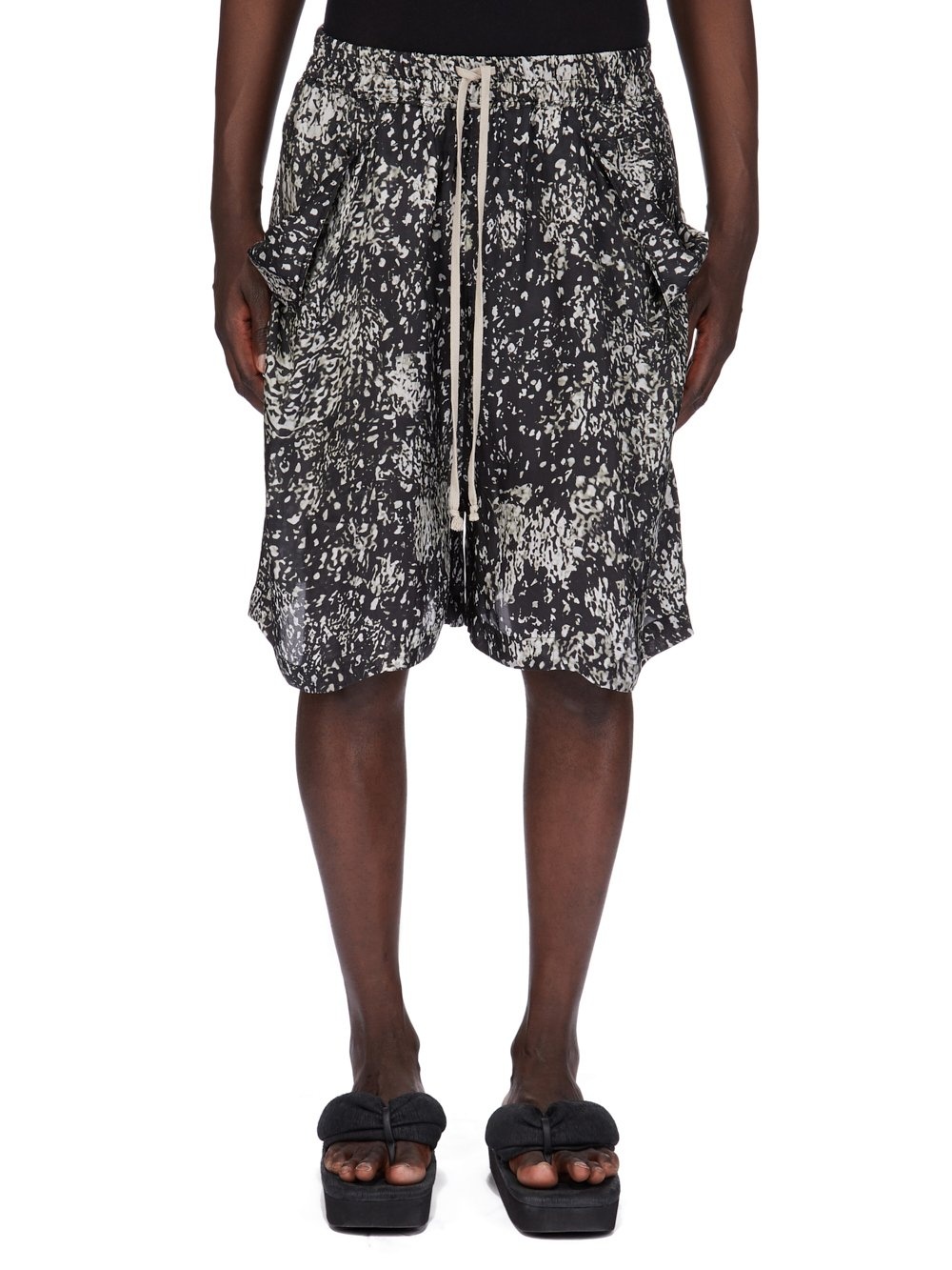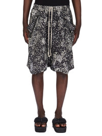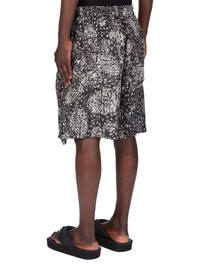 RICK OWENS SS25 HOLLYWOOD LIDO BOXERS IN BLACK/PEARL WOLFFISH PRINTED JAPONETTE THESE LIDO BOXERS ARE KNEE-LENGTH. THEY HAVE AN ELASTICIZED WAISTBAND WITH DRAWSTRING, A LOOSE FIT AND A SLIGHTLY DROPPED CROTCH. THEY HAVE SIDE FRONT POCKETS WITH CORNERS THAT FOLD OUTWARDS AND GAPE SLIGHTLY, AND TWO SQUARE PATCH POCKETS WITH FLAPS ON BACK THIS LIGHTWEIGHT AND FLUID JAPONETTE HAS A COOL HANDFEEL AND IS DIGITALLY PRINTED WITH OUR SEASONAL WOLFFISH MOTIF. THIS FABRIC IS MADE USING CUPRO WHICH IS BIODEGRADABLE AND 100% PLANT BASED. AS IT’S MADE FROM COTTON WASTE, CUPRO HELPS FIND A PURPOSE TO FIBERS THAT WOULD OTHERWISE BE DISCARDED COLOR: BLACK/PEARL MATERIAL: 100% CUPRO MODEL IS 189CM TALL MODEL WEARS SIZE 48