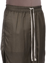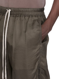 RICK OWENS FW25 CONCORDIANS BOXERS IN BOSCO CUPRO TWILL THESE BOXERS ARE KNEE LENGTH. THEY HAVE AN ELASTICIZED WAIST, A SLIGHTLY DROPPED CROTCH, SIDE WELT POCKETS AND BEVELED SIDE SPLITS THIS LIGHTWEIGHT AND FLUID CUPRO TWILL HAS A GLOSSY SURFACE AND A SOFT, WASHED HANDFEEL THIS FABRIC IS MADE USING CUPRO WHICH IS BIODEGRADABLE AND 100% PLANT BASED. AS IT’S MADE FROM COTTON WASTE, CUPRO HELPS FIND A PURPOSE TO FIBERS THAT WOULD OTHERWISE BE DISCARDED COLOR: BOSCO MATERIAL: 100% CUPRO MODEL IS 189CM TALL MODEL WEARS SIZE 48