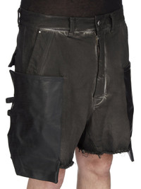 RICK OWENS SS24 LIDO RUNWAY STEFAN CARGO SHORTS IN DARK DUST/BLACK WAX/BLACK 13OZ DRKDUST DENIM, 13OZ BLACK WAX DENIM AND OILY CALF THESE STEFAN CARGO SHORTS ARE KNEE LENGTH, 5 POCKET SHORT, WITH A LOW-RISE AND A LOOSE FIT. THEY HAVE A SILVER BUTTON FLY, BELT LOOPS AND POCKET RIVETS. THEY FEATURE SIDE WELT POCKETS WITH RIVETS, OVERLAYED WITH LARGE POCKETS WITH SQUARE CORNERS AND A BEVELLED BOTTOM THAT EXTEND BELOW THE HEM ON THE FRONT THIGHS. THEY HAVE LOOPS, AND REAR POCKETS WITH FLAPS AND SCRATCH CLOSURESTHIS IS A COMBINATION OF 13OZ DRKDUST DENIM, 13OZ BLACK WAX DENIM AND OILY CALF THIS 13OZ BLACK JAPANESE SELVEDGE DENIM IS GARMENT TREATED WITH A DRKDUST FINISH. THE GARMENT IS FIRST STONE WASHED, THEN OVER SPRAYED WITH THE DRKDUST COLOR AND FINALLY WASHED AGAIN TO CREATE THE VARIOUS SHADINGS THIS GARMENT IS TREATED IN AN ITALIAN WASH HOUSE BASED IN THE VENETO AREA OF ITALY, THAT PRODUCES IN SMALLER TREATMENT BATHS TO REDUCE WATER WASTE AND UTILIZE A WATER PURIFYING PROCESS THAT ENABLES THEM TO RECYCLE A PORTION OF THE WATER USED. ALL OF OUR DENIM WASHES ARE ZDHC CERTIFIED - COLOR: DARK DUST/BLACK WAX/BLACK - MATERIAL: 100% COTTON - POCKETS 100% CALF LEATHER - LOWER PART POCKETS 97% COTTON + 3% ELASTANE - POCKETS LINING 52% POLYESTER + 48% COTTON - SIDE POCKETS LINING 100% COTTON - MODEL IS 189CM TALL - MODEL WEARS SIZE 31