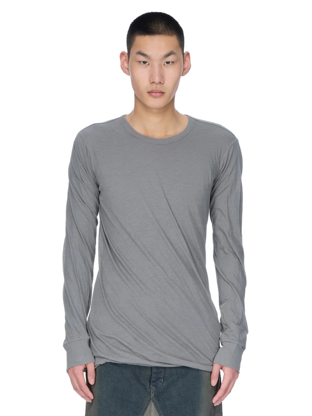 RICK OWENS FW25 CONCORDIANS DOUBLE LS T IN WHASHED INDIGO UNSTABLE COTTON THIS DOUBLE LS T IS BELOW HIP LENGTH AND HAS LONG SLEEVES AND A RIBBED ROUND NECK AND CUFFS. IT FEATURES A DOUBLE LAYER OF FABRIC, WITH THE HEM ON THE FOLD, CREATING A DRAPED EFFECT, AND THE SIGNATURE SINGLE SEAM RUNNING DOWN THE CENTRE BACK SPINE THIS LIGHTWEIGHT COTTON JERSEY IS SEMI-TRANSPARENT WITH A SOFT HANDFEEL THIS JERSEY IS MADE USING GOTS CERTIFIED ORGANIC COTTON WHICH MEANS THE NATURAL FIBER IS GROWN WITHOUT HARMFUL CHEMICALS, LEAVING OUR SOIL, AIR AND WATER CLEANER FROM CONTAMINATES WE STRIVE TO KEEP OUR PRODUCTION AS LOCAL AS POSSIBLE. THE FULL MANUFACTURING CYCLE OF THIS PRODUCT, FROM THE MATERIAL KNITTING TO SEWING AND FINISHING, WAS UNDERTAKEN CLOSE TO OUR HOME BASE IN CONCORDIA, ITALY COLOR: WASHED INDIGO MATERIAL: 100% COTTON MODEL IS 189CM TALL MODEL WEARS SIZE S