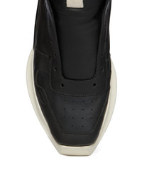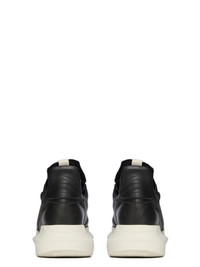 RICK OWENS SS26 TEMPLE GETH RUNNER IN BLACK/BLACK/MILK LINUS LAMB LEATHER THIS GETH RUNNER IS UNDER ANKLE HEIGHT. THEY HAVE A CUSHIONED BACK RISING TO A POINT, AN INTEGRATED ANGLED SIDE STRIPE, A BEVELED EXTENDED TONGUE WITH WEBBING DETAIL, AND CONTRAST LACES. IT FEATURES A THICK GEOMETRIC SOLE WITH AN ANGLED, EXTENDED HEEL. THEY ALSO HAVE AN INTERNAL STRUCTURE THAT ALLOW THE SHOES TO BE WORN WITH OR WITHOUT LACES THIS MEDIUMWEIGHT ALBINO LAMB LEATHER HAS A NATURAL AND WAXY HANDFEEL TANNED IN THE NAPLES AREA OF ITALY, THIS LEATHER IS MADE ON A METAL FREE TANNED WHITE BASE, TUMBLED IN ORDER TO BRING OUT THE NATURAL GRAIN TEXTURE OF THE LEATHER AND FINISHED WITH NATURAL WAX BY HAND TO ACHIEVE THE IRREGULAR ALBINO COLORATION BECAUSE THIS SKIN IS NAKED, NOT FINISHED USING ANY PIGMENTS COVERING THE SKIN, NATURAL MARKINGS AND SHADINGS ARE VISIBLE WHICH MAKES EACH SKIN AND PRODUCT UNIQUE COLOR: BLACK/BLACK/MILK MATERIAL:UPPER 100% LAMB LEATHER LINING 100% LAMB LEATHER INSOLE 100% CALF LEATHER SOLE 100% E.V.A SOLE AT HIGHEST POINT 6CM