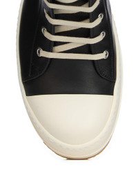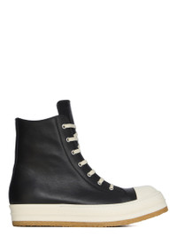 RICK OWENS FW25 CONCORDIANS CREEP SNEAKS IN BLACK/MILK FULL GRAIN COW LEATHER THESE SNEAKS ARE ABOVE ANKLE HEIGHT AND FEATURE EIGHT EYELETS, LACES, A ZIPPER ON THE INSIDE ANKLE FOR EASY FASTENING, TOE CAPS AND SHARK TOOTH SOLES. THIS MEDIUMWEIGHT FULL GRAIN COW LEATHER HAS A FLAT AND MATTE SURFACE FINISH AND IS SPECIFICALLY TANNED FOR SHOES WITH AN ABRASION-RESISTANT FINISH. THIS TANNERY IS LWG CERTIFIED WITH A BRONZE RATING. COLOR: BLACK/MILK MATERIAL: UPPER 100% COW LEATHER LINING 100% CALF LEATHER INSOLE 100% CALF LEATHER SOLE 100% THERMOPLASTIC RUBBER SOLE DETAIL 100% RUBBER SOLE HEIGHT 3.5CM LOWER SOLE HEIGHT 1CM