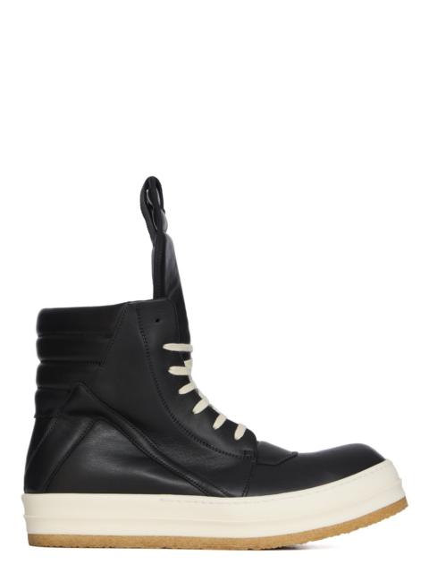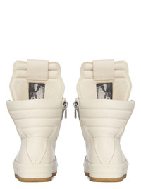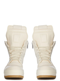 RICK OWENS FW25 CONCORDIANS CREEP GEOBASKET IN MILK/MILK FULL GRAIN COW LEATHER THESE GEOBASKET ARE ABOVE-ANKLE HEIGHT. THEY FEATURE AN EXTENDED TONGUE WITH WEBBING TAB, SIGNATURE GEOMETRIC PANELS AND A PADDED BACK COUNTER WITH LINES OF TOPSTITCHING. THEY HAVE CONTRAST LACES, A ZIPPER ON THE INSIDE ANKLE FOR EASY FASTENING, AND OUR NATURAL CREEPER SOLE THIS MEDIUMWEIGHT FULL GRAIN COW LEATHER HAS A FLAT AND MATTE SURFACE FINISH AND IS SPECIFICALLY TANNED FOR SHOES WITH AN ABRASION-RESISTANT FINISH THIS TANNERY IS LWG CERTIFIED WITH A BRONZE RATING COLOR: MILK/MILK MATERIAL: UPPER 100% COW LEATHER LINING 100% CALF LEATHER INSOLE 100% CALF LEATHER SOLE 100% THERMOPLASTIC RUBBER SOLE DETAIL 100% RUBBER SOLE HEIGHT 3.5CM LOWER SOLE HEIGHT 1CM