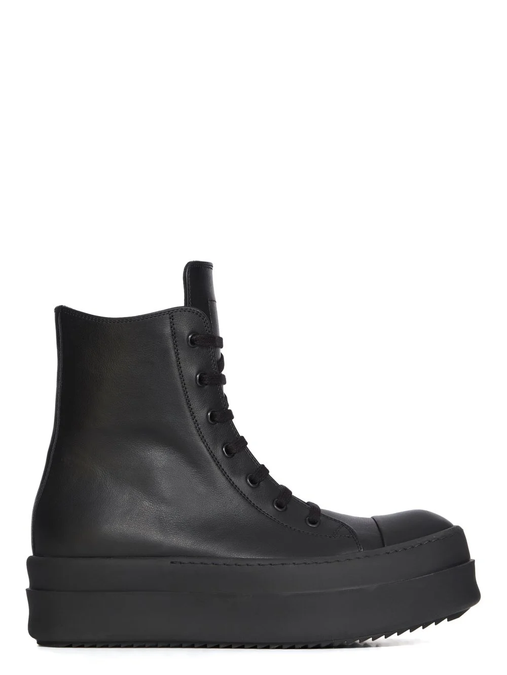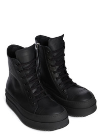 RICK OWENS FW25 CONCORDIANS MEGA BUMPER SNEAKS IN ALL BLACK FULL GRAIN COW LEATHER THESE MEGA BUMPER SNEAKS ARE ABOVE-ANKLE HEIGHT AND FEATURE SEVEN EYELETS, LACES, A ZIPPER ON THE INSIDE ANKLE FOR EASY FASTENING, TOE CAPS AND DOUBLE HEIGHT, SHARK-TOOTHED MEGA BUMPER SOLES THIS MEDIUMWEIGHT FULL GRAIN COW LEATHER HAS A FLAT AND MATTE SURFACE FINISH AND IS SPECIFICALLY TANNED FOR SHOES WITH AN ABRASION-RESISTANT FINISH THIS TANNERY IS LWG CERTIFIED WITH A BRONZE RATING COLOR: ALL BLACK MATERIAL: UPPER 100% COW LEATHER TOE 100% CALF LEATHER LINING 100% CALF LEATHER INSOLE 100% CALF LEATHER SOLE 100% THERMOPLASTIC RUBBER SOLE HEIGHT 4.5CM