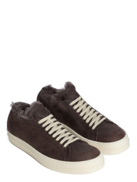 RICK OWENS FW25 CONCORDIANS MINIMAL VINTAGE SNEAKS IN DRKDUST/MILK CURLY SHEARLING THESE MINIMAL VINTAGE SNEAKS ARE UNDER-ANKLE HEIGHT AND HAVE EIGHT EYELETS WITH LACES, TOE CAPS AND SHARK-TOOTHED BUMPER SOLES. THEY FEATURE A PADDED ANKLE. THIS OUR CURLY SHEARLING VERSION. THIS HEAVYWEIGHT SHEARLING LAMB LEATHER HAS A WAXY NAPPA FINISH AND A SOFT NATURAL FUR. TANNED IN THE TUSCANY AREA OF ITALY, THESE SHEARLING MERINO HIDES ARE OF SPANISH ORIGIN, THE UNIQUE THICK FUR OF THESE ANIMALS MAKE THEM PERFECT FOR SHEARLING. BECAUSE THE HAIR IS NATURAL, THERE WILL BE VARIATIONS IN HAIR LENGTH AND TEXTURE, MAKING EACH PIECE UNIQUE. THIS TANNERY IS LWG CERTIFIED WITH A SILVER RATING. COLOR: DRKDUST/MILK MATERIAL: UPPER 100% LAMB SHEARLING REAL FUR INSOLE 100% CALF LEATHER SOLE 100% THERMOPLASTIC RUBBER SOLE HEIGHT 3.5CM