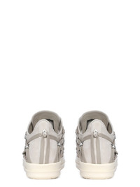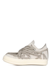 RICK OWENS SS25 HOLLYWOOD MEGALACE LOW SNEAKS IN DINGE/MILK VELOUR SUEDE THESE MEGALACE LOW SNEAKS ARE UNDER-ANKLE HEIGHT AND FEATURE SIX EYELETS, LACES, TOE CAPS AND SHARK TOOTH SOLES. THEY HAVE SIGNATURE MEGALACE, WITH MULTIPLE LAYERS OF LACING FORMING A PENTAGRAM PATTERN THIS HEAVYWEIGHT CROSTA COW SUEDE LEATHER IS MATTE WITH A HAIRY SURFACE TEXTURE. IT HAS A NATURAL AND WAXY HAND FEEL COLOR: DINGE/MILK MATERIAL: UPPER 100% CALF LEATHER TOE 100% CALF LEATHER LINING 100% CALF LEATHER INSOLE 100% CALF LEATHER SOLE 100% THERMOPLASTIC RUBBER