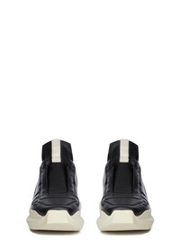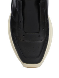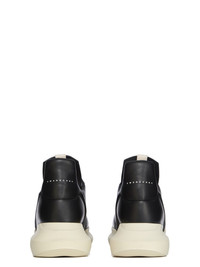 RICK OWENS FW25 CONCORDIANS GETH RUNNER IN BLACK/BLACK/MILK/MILK FULL GRAIN COW LEATHER THIS GETH RUNNER IS UNDER ANKLE HEIGHT. THEY HAVE A CUSHIONED BACK RISING TO A POINT, AN INTEGRATED ANGLED SIDE STRIPE, A BEVELED EXTENDED TONGUE WITH WEBBING DETAIL, AND CONTRAST LACES. IT FEATURES A THICK GEOMETRIC SOLE WITH AN ANGLED, EXTENDED HEEL. THIS VERSION IS DELIVERED WITH LACES, BUT THEY ALSO HAVE AN INTERNAL STRUCTURE AND CAN BE WORN WITH OR WITHOUT THIS MEDIUMWEIGHT FULL GRAIN COW LEATHER HAS A FLAT AND MATTE SURFACE FINISH AND IS SPECIFICALLY TANNED FOR SHOES WITH AN ABRASION-RESISTANT FINISH THIS TANNERY IS LWG CERTIFIED WITH A BRONZE RATING COLOR: BLACK/BLACK/MILK/MILK MATERIAL: UPPER 100% COW LEATHER LINING 100% CALF LEATHER INSOLE 100% CALF LEATHER SOLE 100% E.V.A SOLE AT HIGHEST POINT 6CM