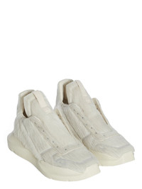 RICK OWENS FW25 CONCORDIANS RUNWAY GETH RUNNER IN MILK/MILK/MILK UNSHAVED COW LEATHER THIS GETH RUNNER IS UNDER ANKLE HEIGHT. THEY HAVE A CUSHIONED BACK RISING TO A POINT, AN INTEGRATED ANGLED SIDE STRIPE, A BEVELED EXTENDED TONGUE WITH WEBBING DETAIL, AND CONTRAST LACES. IT FEATURES A THICK GEOMETRIC SOLE WITH AN ANGLED, EXTENDED HEEL. THIS VERSION IS DELIVERED WITH LACES, BUT THEY ALSO HAVE AN INTERNAL STRUCTURE AND CAN BE WORN WITH OR WITHOUT THIS HEAVYWEIGHT LEATHER IS A HAIR-ON COWHIDE WITH NATURAL LENGTH COARSE HAIR THIS LEATHER IS TANNED IN THE VENETO AREA OF ITALY BY A TANNERY SPECIALIZED IN HAIR-ON COW LEATHER. BECAUSE THE HAIR IS NATURAL THERE CAN BE INCONSISTENCY IN THE LENGTH DIRECTION, TEXTURE AND COLOR THIS COLOR IS ACHIEVED BY BLEACHING THE NATURAL COW HAIR. VARIATIONS IN COLOR AND ESPECIALLY YELLOW SHADINGS CAN BE PRESENT DUE TO NATURAL URINE STAINS. THIS MEANS NO TWO PRODUCTS ARE EXACTLY ALIKE, GIVING EACH ITS INDIVIDUAL UNIQUENESS. THIS IS NOT TO BE CONSIDER DEFECT BUT IS THE VISUAL ASPECTS DESIRED SPECIFICALLY BY RICK OWENS THIS TANNERY IS LWG CERTIFIED WITH A SILVER RATING COLOR: MILK/MILK/MILK MATERIAL: 100% COW REAL FUR LINING 100% CALF LEATHER INSOLE 100% CALF LEATHER SOLE AT HIGHEST POINT 6CM