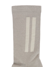 RICK OWENS FW25 CONCORDIANS GLITTER SOCKS IN PEARL/PEARL COTTON KNIT THESE GLITTER SOCKS ARE SHORT-LENGTH. THEY FEATURE SIGNATURE DOUBLE LINES ON THE OUTER ANKLE OF THE LEFT SOCK, THE WORDS "RICK OWENS" ON THE BOTTOM OF THE RIGHT SOCK AND WHITE SOLES ON BOTH THIS A LIGHTWEIGHT AND SOFT CLASSIC STITCH COTTON KNIT COLOR: PEARL/PEARL MATERIAL: 60% COTTON + 30% NYLON + 10% ELASTANE MODEL IS 189CM TALL MODEL WEARS SIZE 3