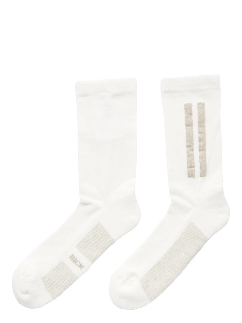 RICK OWENS SS26 TEMPLE GLITTER SOCKS IN MILK/PEARL COTTON KNIT THESE GLITTER SOCKS ARE SHORT-LENGTH. THEY FEATURE SIGNATURE DOUBLE LINES ON THE OUTER ANKLE OF THE LEFT SOCK, THE WORDS "RICK OWENS" ON THE BOTTOM OF THE RIGHT SOCK AND WHITE SOLES ON BOTH THIS IS A LIGHTWEIGHT AND SOFT CLASSIC STITCH COTTON KNIT COLOR: MILK/PEARL MATERIAL:60% COTTON + 30% NYLON + 10% ELASTANE MODEL IS 189CM TALL