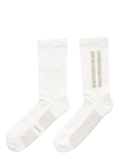 RICK OWENS SS26 TEMPLE GLITTER SOCKS IN BLACK / PEARL COTTON KNIT THESE GLITTER SOCKS ARE SHORT-LENGTH. THEY FEATURE SIGNATURE DOUBLE LINES ON THE OUTER ANKLE OF THE LEFT SOCK, THE WORDS "RICK OWENS" ON THE BOTTOM OF THE RIGHT SOCK AND WHITE SOLES ON BOTH THIS IS A LIGHTWEIGHT AND SOFT CLASSIC STITCH COTTON KNIT COLOR: BLACK / PEARL MATERIAL:60% COTTON + 30% NYLON + 10% ELASTANE MODEL IS 189CM TALL