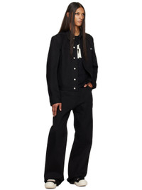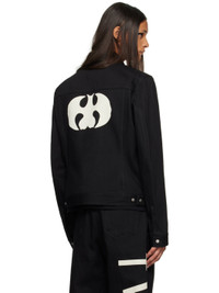 Non-stretch denim jacket. · Spread collar · Button closure · Logo patch at chest · Welt pockets · Single-button barrel cuffs · Logo printed at back · Adjustable button tabs at back hem · Partial satin lining Part of the RICK OWENS\KEMBRA PFAHLER collaboration. Part of the SSENSE XX exclusive offering. Supplier color: Black/Milk