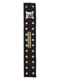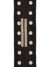 DRKSHDW SS26 TEMPLE STROBE NECK BAND IN BLACK 8OZ DEEP BLACK DENIM THIS STROBE NECK BAND IS A DENIM STRAP WITH ALL OVER SNAPS, TO BE WORN AROUND THE NECK. THIS LIGHTWEIGHT DEEP BLACK DENIM IS MADE ON AN ITALIAN 8OZ BLACK AND NATURAL DENIM. THE READY GARMENT IS OVERDYED BLACK AND THEN A DEEP BLACK WAX IS APPLIED IN A THICK LAYER BY HAND. THIS GARMENT IS TREATED IN AN ITALIAN WASH HOUSE BASED IN THE VENETO AREA OF ITALY, THAT PRODUCES IN SMALLER TREATMENT BATHS TO REDUCE WATER WASTE AND UTILIZE A WATER PURIFYING PROCESS THAT ENABLES THEM TO RECYCLE A PORTION OF THE WATER USED. ALL OF OUR DENIM WASHES ARE ZDHC CERTIFIED. COLOR: BLACK MATERIAL:97% COTTON + 3% ELASTANE LINING 100% COTTON EMBROIDERY 100% POLYESTER THIS ITEM IS AVAILABLE IN ONE SIZE