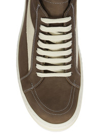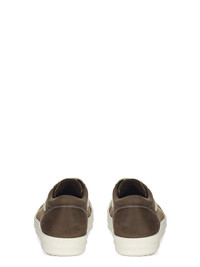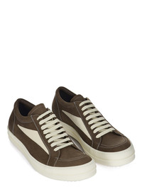 RICK OWENS FW24 PORTERVILLE VINTAGE SNEAKS IN SADDLE/MILK/MILK GREYWOLF NUBUCK AND VELOUR SUEDE THESE VINTAGE SNEAKS ARE UNDER-ANKLE HEIGHT AND HAVE EIGHT EYELETS WITH LACES, TOE CAPS AND SHARK TOOTHED BUMPER SOLES. THEY FEATURE A TRIANGULAR LEATHER APPLIQUE ON THE SIDE FOOT, A PADDED ANKLE AND CONTRAST STITCHING THIS IS A COMBINATION OF GREYWOLF NUBUCK AND VELOUR SUEDE THIS HEAVYWEIGHT BULL LEATHER HAS A BRUSHED NUBUCK FINISH AND WAXY HANDFEEL. BECAUSE THIS SKIN IS NAKED, NOT FINISHED USING ANY PIGMENTS COVERING THE SKIN, NATURAL MARKINGS AND SHADINGS ARE VISIBLE WHICH MAKES EACH SKIN AND PRODUCT UNIQUE. THIS TANNERY IS LWG CERTIFIED WITH A SILVER RATING. - COLOR: SADDLE/MILK/MILK - MATERIAL: UPPER 100% BULL LEATHER - LATERAL DETAILS 100% CALF LEATHER - LINING 100% CALF LEATHER - INSOLE 100% CALF LEATHER - SOLE 100% THERMOPLASTIC RUBBER