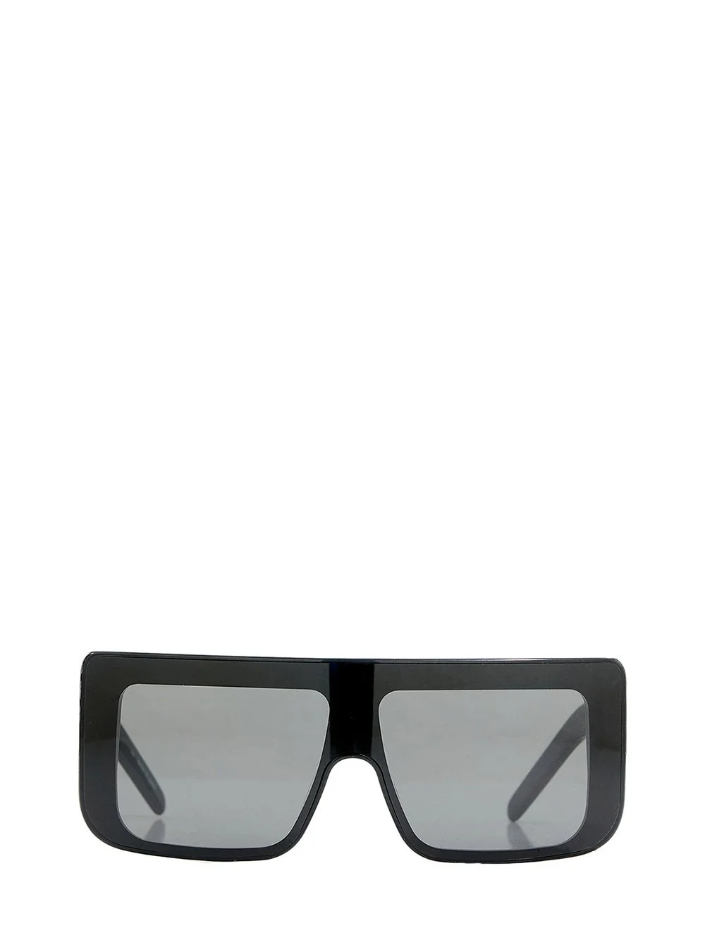 RICK OWENS DOCUMENTA SUNGLASSES THESE DOCUMENTA SUNGLASSES FEATURE A LARGE BLACK ACETATE RECTANGULAR FRAME AND A BLACK SINGLE CUT LENS. THEY HAVE WIDE ARMS WITH THE SIGNATURE TRIO OF SILVER RIVETS ON EACH TEMPLE AND RICK OWENS LOGO ON INSIDE RIGHT - COLOR: BLACK - FRAME: 100% ACETATE - LENSES: 100% NYLON -NOT SUITABLE FOR CONVERSION INTO PRESCRIPTION GLASSES