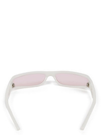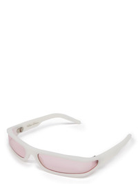 RICK OWENS FOG SUNGLASSES IN WHITE WITH PINK LENS THESE FOG SUNGLASSES ARE SLIM WRAP AROUND FRAME WITH LENS THAT FOLDS AROUND THE TEMPLE. THEY HAVE SLIM ARMS AND RICK OWENS LOGO ON EACH TEMPLE - COLOR: WHITE TEMPLE/PINK LENS - MATERIAL: FRAME 100% GRILAMID - LENSES: 100% NYLON -NOT SUITABLE FOR CONVERSION INTO PRESCRIPTION GLASSES