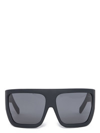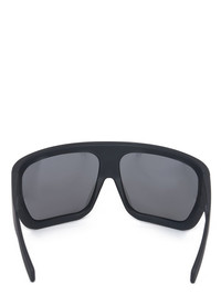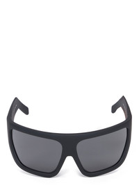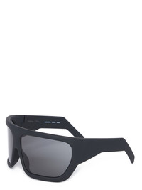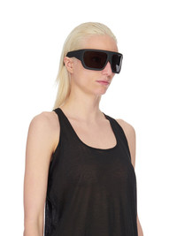RICK OWENS DAVIS SUNGLASSES IN BLACK THESE DAVIS SUNGLASSES ARE LARGE WRAP AROUND FRAMES WITH GEOMETRIC CURVED LENSES. THEY HAVE THICK ANGLED ARMS AND RICK OWENS LOGO ON INSIDE RIGHT - COLOR: BLACK TEMPLE/BLACK LENS - MATERIAL: FRAME 100% GRILAMID - LENSES: 100% NYLON -NOT SUITABLE FOR CONVERSION INTO PRESCRIPTION GLASSES