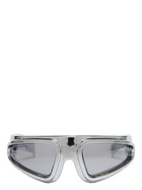 RICK OWENS RYDER SUNGLASSES IN SILVER/SILVER THESE RYDER SUNGLASSES ARE A PAIR OF WRAP-AROUND FRAMES WITH AN EMPHASIS ON PERIPHERAL SIGHT. THEY FEATURE A BOLD STRAIGHT EYEBROW RIDGE, WITH DEEP SET LENSES EDGED WITH A THICK PROTRUDING FRAME AND RICK OWENS SIGNATURE THICK ANGLED ARMS WITH LOGO ON INSIDE RIGHT COLOR: SILVER TEMPLE/SILVER LENS MATERIAL: FRAME 100% NYLON LENSES 100% NYLON NOT SUITABLE FOR CONVERSION INTO PRESCRIPTION GLASSES