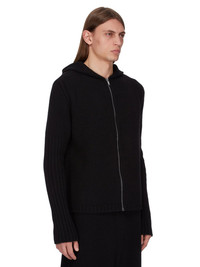 RICK OWENS SS25 HOLLYWOOD IPPED HOODIE IN BLACK LAS PALMAS CASHMERE KNIT THIS ZIPPED HOODIE IS HIP LENGTH. IT HAS LONG SLEEVES, RIBBED CUFFS AND HEM. IT HAS A CENTER FRONT ZIPPER AND A HOOD. IT FEATURES THICK KNIT LINES AT THE ARM HOLE AND WIDE VERTICAL RIB LINES DESCENDING FROM THE UPPER ARM TO THE WRIST. IT HAS THE SIGNATURE KNIT CHANNEL RUNNING DOWN BOTH THE CENTER BACK SPINE THIS HEAVYWEIGHT CASHMERE KNIT HAS A SOFT AND WARM HANDFEEL. IT IS KNITTED BOTH IN A CLASSIC RASATO STITCH AND A WIDE RIB COLOR: BLACK MATERIAL: 100% CASHMERE MODEL IS 189CM TALL MODEL WEARS SIZE M