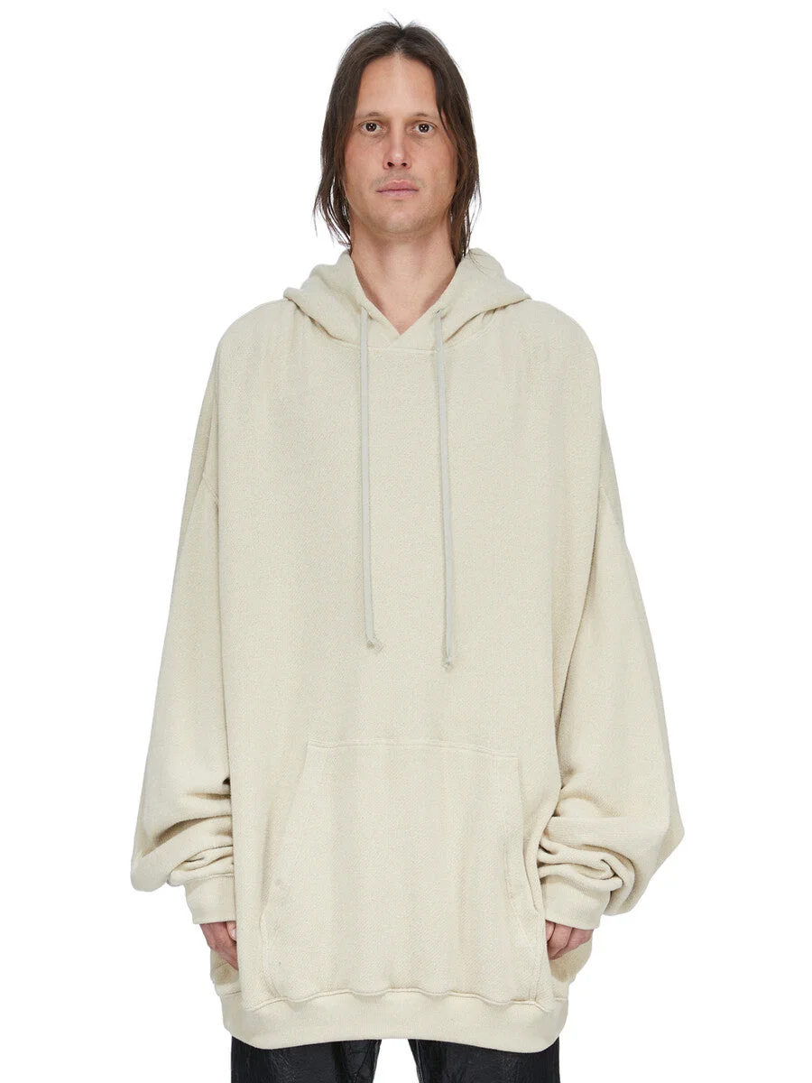 RICK OWENS SS26 TEMPLE HUN HOODIE IN SAND NEP TERRY JERSEY THIS HUN HOODIE IS BELOW HIP LENGTH WITH LONG, WIDE SLEEVES WITH LOW SHOULDERS AND AN OVERSIZED FIT. IT HAS A BIG HOOD WITH DRAWSTRINGS, A BIG FRONT POCKET WITH OPENINGS ON EACH SIDE. IT HAS RIBBED CUFFS AND HEM, AND A SINGLE CHANNEL RUNNING DOWN THE CENTRE BACK SPINE. THIS HEAVYWEIGHT JERSEY IS KNITTED USING TEXTURED NEP YARNS AND HAS A BRUSHED FINISH. THIS JERSEY IS MADE USING GOTS CERTIFIED ORGANIC COTTON WHICH MEANS THE NATURAL FIBER IS GROWN WITHOUT HARMFUL CHEMICALS, LEAVING OUR SOIL, AIR AND WATER CLEANER FROM CONTAMINATES. COLOR: SAND MATERIAL:100% COTTON MODEL IS 189CM TALL ITEM IS AVAILABLE IN ONE SIZE