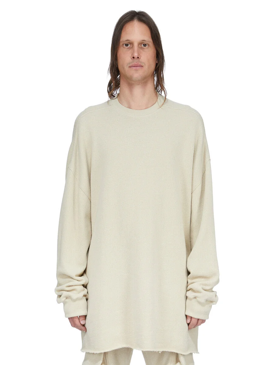 RICK OWENS SS26 TEMPLE TOMMY LS T IN SAND NEP TERRY JERSEY THIS TOMMY LS T IS BELOW-HIP LENGTH WITH A JUMBO OVERSIZED FIT. IT HAS LONG SLEEVES WITH A DROPPED ARMHOLE, RAW CUT HEMS AND A RIBBED CREWNECK AND CUFFS. IT FEATURES SIGNATURE FRONT LEVEL SHOULDER SEAMS. THIS HEAVYWEIGHT JERSEY IS KNITTED USING TEXTURED NEP YARNS AND HAS A BRUSHED FINISH. THIS JERSEY IS MADE USING GOTS CERTIFIED ORGANIC COTTON WHICH MEANS THE NATURAL FIBER IS GROWN WITHOUT HARMFUL CHEMICALS, LEAVING OUR SOIL, AIR AND WATER CLEANER FROM CONTAMINATES. COLOR: SAND MATERIAL:100% COTTON MODEL IS 189CM TALL ITEM IS AVAILABLE IN ONE SIZE