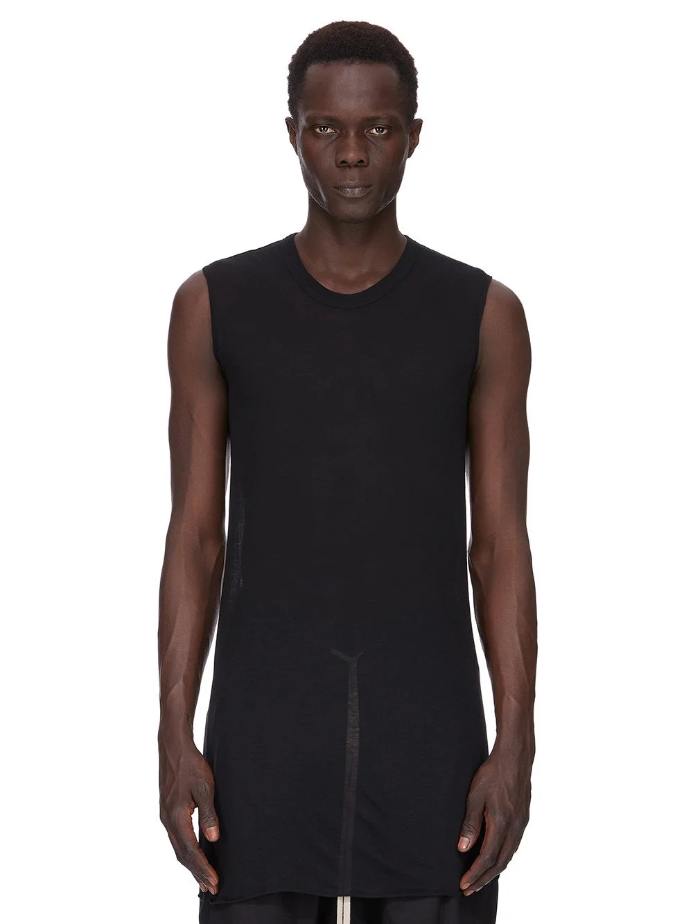 RICK OWENS FOREVER BASIC SL T IN BLACK UNSTABLE COTTON THIS BASIC SL T IS BELOW HIP LENGTH AND SLEEVELESS. IT HAS A RIBBED ROUND NECK, RAW CUT HEM AND REINFORCED RAW SHOULDERS. IT FEATURES THE SIGNATURE SINGLE SEAM RUNNING DOWN THE CENTRE BACK SPINE THIS LIGHTWEIGHT COTTON JERSEY IS SEMI-TRANSPARENT WITH A SOFT HANDFEEL. THIS JERSEY IS MADE USING GOTS CERTIFIED ORGANIC COTTON WHICH MEANS THE NATURAL FIBER IS GROWN WITHOUT HARMFUL CHEMICALS, LEAVING OUR SOIL, AIR AND WATER CLEANER FROM CONTAMINATES WE STRIVE TO KEEP OUR PRODUCTION AS LOCAL AS POSSIBLE. THE FULL MANUFACTURING CYCLE OF THIS PRODUCT, FROM THE MATERIAL KNITTING TO SEWING AND FINISHING, WAS UNDERTAKEN CLOSE TO OUR HOME BASE IN CONCORDIA, ITALY. - COLOR:BLACK - MATERIAL: 100% COTTON - MODEL IS WEARING SIZE S - MODEL IS 189 CM TALL