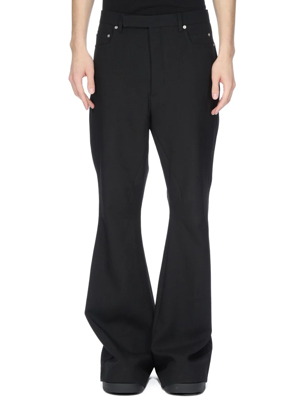 RICK OWENS FW25 CONCORDIANS TAILORED BOLAN IN BLACK GRAIN DE POUDRE THESE TAILORED BOLAN ARE A HIGH WAISTED, SLIM FIT 6-POCKET PANT WITH A STRAIGHT FIT AND A REGULAR CROTCH. THEY HAVE A CLASSIC TAILORED WAISTBAND WITH A CONCEALED ZIPPER AND WRAP BUTTON CLOSURE, BACK WELT POCKETS WITH BUTTONS, AND PRESSED CREASES ON THE FRONT AND BACK LEG THIS MEDIUMWEIGHT WOOL GRAIN DE POUDRE FABRIC HAS A ROUND AND SOFT HANDFEEL THIS FABRIC IS MADE FROM RWS CERTIFIED VIRGIN WOOL WHICH ENSURES A HIGH STANDARD IN ANIMAL WELFARE, ENVIRONMENTAL SUSTAINABILITY AND SOCIAL RESPONSIBILITY. EACH BALE OF WOOL IS TRACEABLE BACK TO ITS SOURCE COLOR: BLACK MATERIAL: 100% NEW WOOL LINING 100% CUPRO BUTTONS 100% BUFFALO HORN MODEL IS 189CM TALL MODEL WEARS SIZE 48