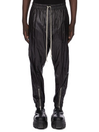 RICK OWENS SS26 TEMPLE TECUATL TRACK PANT IN BLACK SHINY NYLON THESE TECUATL TRACK PANTS ARE FULL-LENGTH WITH A SLIGHTLY DROPPED CROTCH. THEY HAVE AN ELASTICIZED WAISTBAND WITH A DRAWSTRING, AND A STITCHED FLY. THEY FEATURE TWO DIAGONAL SIDE FRONT POCKETS, BACK WELT POCKETS WITH SNAPS AND ELASTICIZED HEMS WITH A ZIPPERED SLIT ON THE FRONT SHIN. THIS AIRY AND LIGHTWEIGHT NYLON IS MADE USING GRS CERTIFIED RECYCLED NYLON WHICH ENSURES A REDUCTION IN WATER CONSUMPTION, EMISSIONS AND HAZARDOUS WASTE, LESSENING THE DEPENDENCE ON NON-RENEWABLE RESOURCES. COLOR: BLACK MATERIAL:100% NYLON BUTTONS 100% BUFFALO HORN MODEL IS 189CM TALL MODEL WEARS SIZE 48