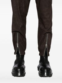 Tecuatl trousers Highlights - Coffee brown - Front tie fastening - Two side slash pockets - Two rear welt pockets - Zip details Imported Composition Lining: Cupro 94%, Elastane 6% Outer: Lambskin 100% SIZE & FIT Model measurements Height 6 ft 3 in(1.9 m) Bust/Chest 19.29 in(49 cm) Hips 38.58 in(98 cm) Waist 32.28 in(82 cm) FittingInformation Designed for a tapered leg, offering a loose unrestricted fit over the leg with a closer fit towards the ankle The elasticated waist allows for a comfortable fit Soft leather has a supple and smooth construction offering some flexibility Washing instructions Specialist Cleaning