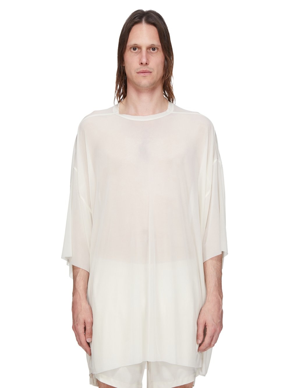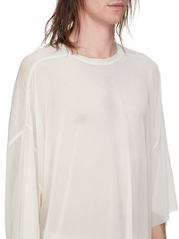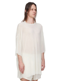 RICK OWENS SS25 HOLLYWOOD RUNWAY TOMMY T IN DINGE STRETCH CUPRO JERSEY THIS TOMMY T IS BELOW-HIP LENGTH WITH A JUMBO OVERSIZED FIT. IT HAS WIDE, SHORT SLEEVES WITH A DROPPED ARMHOLE AND A RIBBED CREWNECK. IT FEATURES SIGNATURE FRONT LEVEL SHOULDER SEAMS THIS LIGHTWEIGHT AND SEMI TRANSPARENT CUPRO JERSEY IS STRETCHY WITH A SOFT AND COOL HANDFEEL. THIS JERSEY IS MADE USING CUPRO WHICH IS BIODEGRADABLE AND 100% PLANT BASED. AS IT’S MADE FROM COTTON WASTE, CUPRO HELPS FIND A PURPOSE TO FIBERS THAT WOULD OTHERWISE BE DISCARDED COLOR: DINGE MATERIAL: 92% CUPRO 8% ELASTANE MODEL IS 189CM TALL ITEM IS AVAILABLE IN ONE SIZE