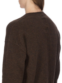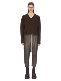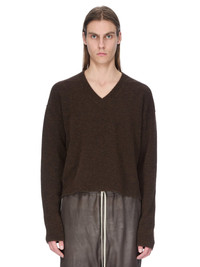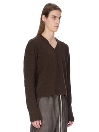 RICK OWENS FW25 CONCORDIANS TOMMY V NECK IN BROWN ALPACA KNIT THIS TOMMY V NECK IS HIP LENGTH WITH AN OVERSIZED FIT. IT HAS LONG SLEEVES WITH WIDE SHOULDERS AND A DROPPED ARMHOLE. IT HAS A RIBBED V NECK AND HEM, SIGNATURE FRONT LEVEL SHOULDER LINE AND KNIT CHANNEL RUNNING DOWN THE CENTRE BACK SPINE THIS A DENSE BUT LIGHT KNIT WITH A SOFT SLIGHTLY FLUFFY HAND COLOR: BROWN MATERIAL: 48% ALPACA + 30% NYLON + 20% WOOL + 2% ELASTANE MODEL IS 189CM TALL MODEL WEARS SIZE M