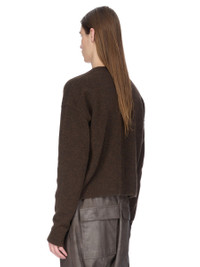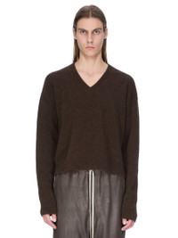 RICK OWENS FW25 CONCORDIANS TOMMY V NECK IN BROWN ALPACA KNIT THIS TOMMY V NECK IS HIP LENGTH WITH AN OVERSIZED FIT. IT HAS LONG SLEEVES WITH WIDE SHOULDERS AND A DROPPED ARMHOLE. IT HAS A RIBBED V NECK AND HEM, SIGNATURE FRONT LEVEL SHOULDER LINE AND KNIT CHANNEL RUNNING DOWN THE CENTRE BACK SPINE. THIS A DENSE BUT LIGHT KNIT WITH A SOFT SLIGHTLY FLUFFY HAND. COLOR: BROWN MATERIAL: 48% ALPACA + 30% NYLON + 20% WOOL + 2% ELASTANE MODEL IS 189CM TALL MODEL WEARS SIZE M