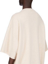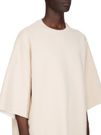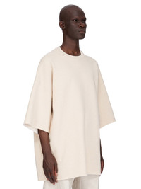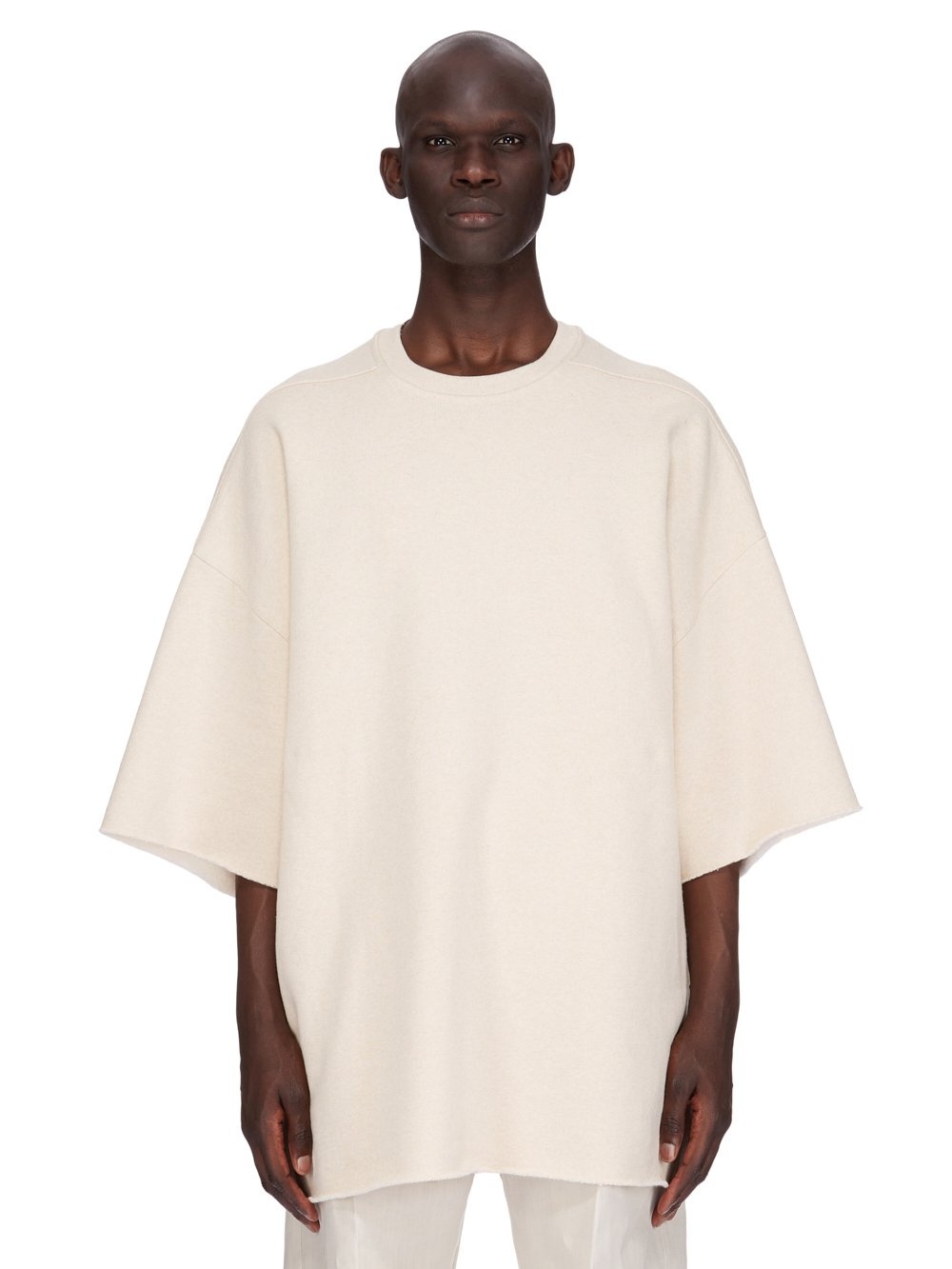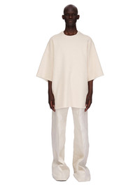 RICK OWENS SS25 HOLLYWOOD TOMMY T IN NATURAL BRUSHED TERRY JERSEY THIS TOMMY T IS BELOW-HIP LENGTH WITH A JUMBO OVERSIZED FIT. IT HAS WIDE, SHORT SLEEVES WITH A DROPPED ARMHOLE AND A RIBBED CREWNECK. IT FEATURES SIGNATURE FRONT LEVEL SHOULDER SEAMS THIS HEAVYWEIGHT TERRY JERSEY HAS A SOFT BRUSHED BACKSIDE THIS JERSEY IS MADE USING GOTS CERTIFIED ORGANIC COTTON WHICH MEANS THE NATURAL FIBER IS GROWN WITHOUT HARMFUL CHEMICALS, LEAVING OUR SOIL, AIR AND WATER CLEANER FROM CONTAMINATES COLOR: NATURAL MATERIAL: 100% COTTON MODEL IS 189CM TALL ITEM IS AVAILABLE IN ONE SIZE