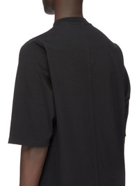 RICK OWENS SS24 LIDO RON JUMBO SS T IN BLACK AND PEARL RON EMBROIDERED HEAVY JERSEY THIS RON JUMBO SS T IS BELOW HIP LENGTH WITH AN OVERSIZED FIT. IT HAS A RIBBED CREWNECK AND ELBOW-LENGTH SHORT SLEEVES. IT FEATURES SIGNATURE FRONT LEVEL SHOULDER SEAMS AND A CENTRE BACK SEAMTHIS VERSION FEATURES AN EMBROIDERY OF RON ATHEY, IN HIS WORK "INCORRUPTIBLE FLESH, 2014", WEARING A MASK BY HERMES PITTAKOS, PHOTOGRAPHED BY MANUEL VASON THIS HEAVYWEIGHT JERSEY IS COMPACT WITH A DRY HANDFEEL. THIS JERSEY IS MADE USING GOTS CERTIFIED ORGANIC COTTON WHICH MEANS THE NATURAL FIBER IS GROWN WITHOUT HARMFUL CHEMICALS, LEAVING OUR SOIL, AIR AND WATER CLEANER FROM CONTAMINATES THIS PRODUCT IS EMBELLISHED WITH OUR SEASONAL RON EMBROIDERY. - COLOR: BLACK/PEARL - MATERIAL: 100% COTTON - EMBROIDERY 100% POLYESTER - MODEL IS 189CM TALL - MODEL WEARS SIZE S